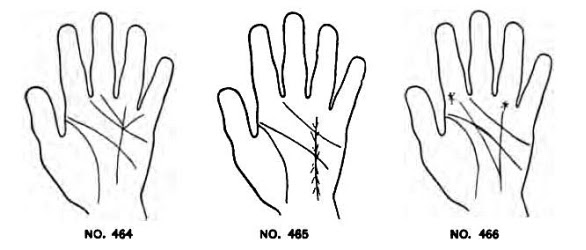 If the business world be strong, these people will be only partially successful, and even with some of the beneficial effects of the line present, will make may costly mistakes. With breaks in the line, one cannot see more than ordinary success for the subject, and many failures. With all breaks seen in the line, look for repair signs which will tend to overcome the obstacles and bring about better conditions. The usual repair signs will be found in a variety of combinations (446). Such a repaired line is not better in grade than a broad and shallow one.